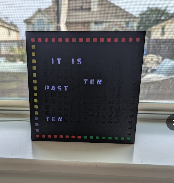 A 3d printed clock, lit by a 16x16 LED light matrix driven by a Raspberry PI
