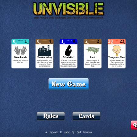 One room, one hit man, one target, one outcome?. A card game where you play a hit man, trying to complete a series of contract hits. |