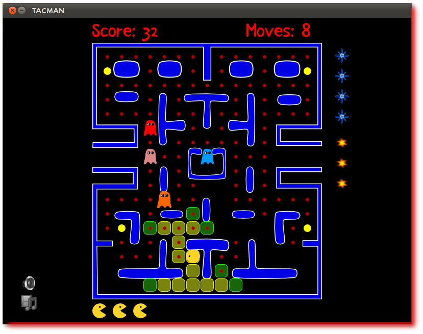 Guide your TACMAN around the maze to eat all the red pills just like the original PACMAN game except that you and the ghosts take it in turns to move. Eating the yellow pills turns the ghosts blue for a while and you can eat them too.